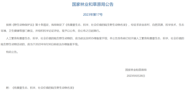 事件:在2023年6月,国家林业和草原局公布了新调整后的《有重要生态、科学、社会价值的陆生野生动物名录》,并于公布之日起施行。在此次调整当中,新“三有”名录新增了700多种野生动物,大幅扩大了野生动物保护范围。