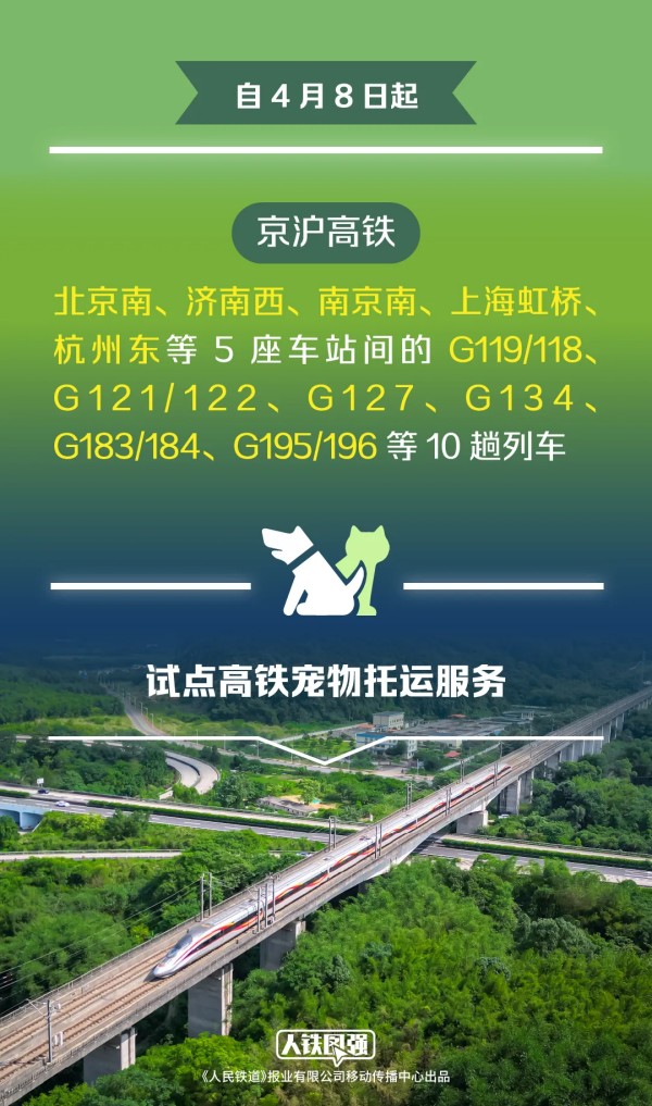 铁路12306推出“宠物托运”功能 4月8日起,铁路部门在京沪高铁部分车次试点“隔离运输、人宠分开、专人看护”的高铁宠物托运服务,铁路12306同步推出“宠物托运”功能,旅客提前2天及以上线上预约,预约成功后可同车托运1只家庭驯养且健康状况良好、单只体重不超过15公斤、肩高不超过40厘米的猫、犬类宠物。