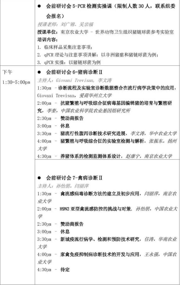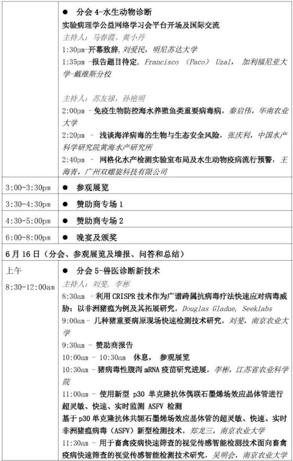 领域权威联合,当“夏”共展行业盛会!国际兽医检测诊断大会由国际动物卫生合作伙伴、美国爱荷华州立大学、美国堪萨斯州立大学、南达卡塔州立大学、美国乔治亚大学、美国明尼苏达大学、中国农业大学、南京农业大学的多位知名专家发起,致力于通过强有力的兽医诊断提高动物健康与食品安全。大会由国际兽医检测诊断大会组委会、中国农业大学、南京农业大学动物医学院、世信朗普国际展览(北京)有限公司、农宜科科技(郑州)有限公司主办,中国医学装备协会病理装备分会、实验病理学公益网络学习会平台、四川农业大学协办,在中国已成功举办了五届,亚洲目前最大的兽医检测诊断领域的专业会议。 2024年6月24-26日,第五届国际兽医检测诊断大会在杭州国际博览中心成功举办,来自中国、美国、英国、荷兰、澳大利亚等10多个国家的120位嘉宾,在3天内为1660位参会代表带来了128场主题报告,为行业提供了一个严谨专业的学习平台。大会聚焦兽医诊断行业的最新技术和方法以及研究成果,被业内评价为是契合时代前沿资讯,对兽医诊断的发展与进步、畜牧养殖业和食品安全有着很高价值的高品质论坛。 第六届国际兽医检测诊断大会定于2025年6月14-16日在南京国际展览中心举行,大会将继续秉承“强有力的兽医诊断,提高动物健康与食品安全”的办会宗旨,重点邀请亚、美、欧国家权威兽医检测诊断专家主讲,为参会代表带来全球兽医检测行业的最新进展,分享实验病理学、分子诊断、病毒学/血清学、微生物学、兽医检测的认证、现场快速检测、实验室安全、实验室质量管理等领域的国际最新资讯和研究成果。本届兽医检测大会参会代表预计超过3000人。 同期举办的亚洲兽医器械及药品展览会是目前唯一一个专注于兽医器械及药品的展示交流平台,上届展览会共吸引了171家跨国企业及行业知名企业的积极参与,展示面积10000平米。 本届展览会将全面展示兽医器械、药品及行业相关的产品、服务、最新成果与技术。预计本届展览会参展企业300余家,展示面积2万平米,专业观众人数20000人次。 一、本届亮点 1. 新增学术委员会 为了把AVDC打造成国际高水平的兽医检测诊断学习与交流的平台,本届组委会邀请到积极、热心参与AVDC的行业精英,组成学术委员会。委员会成员在兽医检测诊断领域有坚实的学术研究水平和实践经验,他们的加入将为AVDC增加新鲜血液。学术委员会将为高质量的AVDC提供坚强有力的保障。 2. 新增行业委员会 第六届国际兽医检测诊断大会正式设立“行业委员会”,为兽医检测诊断及畜牧行业的发展注入全新活力。委员会成员均为来自行业内领头企业的资深专家,他们经验丰富、成果斐然。这些成员将凭借专业知识与行业洞察,推动技术革新、促进信息共享,共同探索行业发展新路径,引领行业迈向高质量发展新征程。 3. 新增“PCR检测技术实操课(会前研讨会5)” 根据行业发展的需求,今年的兽医检测大会精心开设“PCR检测实操课”!课程集理论与实操于一体,是从业者提升技能的绝佳契机。无论行业新手还是经验丰富的从业者,都能从中受益。 PCR检测技术实操课诚邀行业同仁踊跃报名参加,有意参加实操课的同仁,请联系组委会,培训人员数量不超过30人,先到先得。PCR检测技术实操课同时邀请企业参与赞助,开拓市场,携手共进。 (1)培训内容 临床样品采集注意事项; qPCR理论与注意事项讲解:以非洲猪瘟和猪链球菌为例; qPCR实操:以猪链球菌为例。 (2)授课单位 南京农业大学-世界动物卫生组织猪链球菌参考实验室 4. 中国科学院院士加入嘉宾阵容 组委会荣幸地邀请到中国科学院院士陈化兰女士参加第六届国际兽医检测诊断大会!陈院士是中国动物疫病防控领域的重要专家,长期在动物传染病研究和防控工作中做出了卓越贡献,特别是在禽流感等重大动物疫病的防控方面,具有重要影响力。 二、大会日程 三、首轮嘉宾