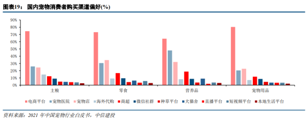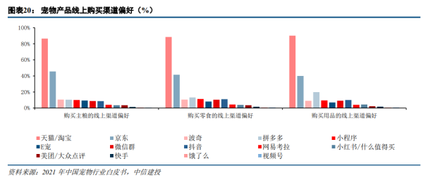 据中信建投发布的《证券期货投资者适当性管理办法》显示,整体来看,电商平台仍为消费者购买宠物食品与用品的主要渠道,消费者偏好均超60%。其中综合电商如淘宝与京东,仍然是宠物主在进行线上消费的首要选择,此外拼多多在宠物用品方面较其他平台有相对优势。