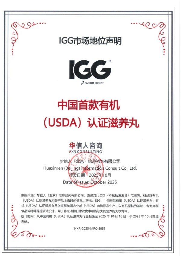 宠业家消息,近日,IGG品牌官方宣布,其新推出的“有机金典滋养丸”已正式获得美国农业部(USDA)有机认证。其中USDA认证全球公认的有机产品权威标准,标志着IGG在产品品质与国际标准接轨方面取得重要进展,进一步强化了其在鹦鹉营养领域的品牌公信力与市场竞争力。