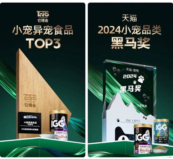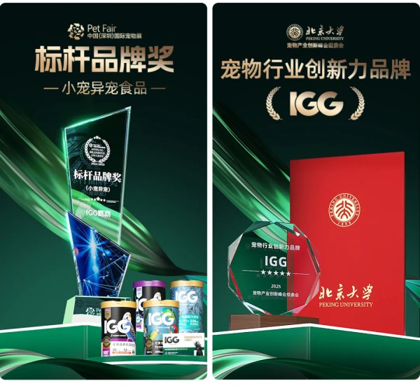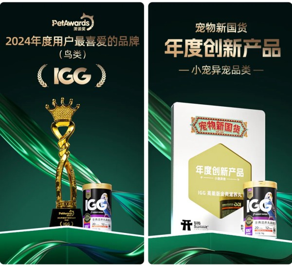 2024年,IGG多款产品凭借创新性与高品质获得行业认可。在宠物新国货大会期间,高能版金典滋养丸荣获“年度创新产品奖”;同年5月,该产品在它博会期间入选“小宠异宠食品TOP3”。