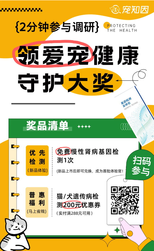 致毛孩子家长 养宠路上,突发的小病还不是最让人心慌的,那些藏在基因里、悄悄恶化的遗传病,一旦爆发,就仿佛给毛孩子的生命按下了加速键。 就像困扰很多猫猫家庭的多囊性肾病,患病猫出生时肾脏就带着微小囊肿,囊肿随着小猫长大也在扩散、变大,逐渐侵蚀正常组织,直到猫出现多饮多尿、呕吐贫血,甚至你能察觉到这些状况的时候,已经到了肾衰竭的阶段。 类似这样的遗传病几乎无法根治,不仅毛孩子遭罪,我们看着它从活泼到虚弱,也是既心疼又无力。但其实,很多遗传病只要提前了解,就能早做准备:调整饮食、定期针对性体检、避免诱发因素,能够大大延缓病情发展,让毛孩子少受痛苦,让陪伴更长久。 宠知因招募 新品体验官 现在,宠知因正在筹划一款宠物遗传病风险评估基因检测的新产品,专门针对高发遗传病,帮你提前了解毛孩子的基因风险,从源头做好健康管理。 这款产品,想请你一起设计! 我们深知,只有真正养宠的人,才最清楚需要什么样的检测服务。 是想知道具体的饮食调整方案,还是需要明确的体检提醒?是担心采样麻烦,还是在意报告好不好懂? 所以这款产品不该由我们闭门造车,而是要靠你这位资深宠主来把关! 诚邀毛孩子家长 参与调研 诚邀你花2分钟参与调研,说说你的真实需求和顾虑,你的每一个答案,都会直接影响产品设计,让它更贴合你和毛孩子的需求。 为了感谢你的参与,我们准备了双重福利: 完成调研即可获得200元基因检测券(实付满288元可用),后续给毛孩子做检测直接省一笔; 还有机会获得新品免单资格,上线后优先免费体验,第一时间掌握毛孩子的基因健康情况。 长按扫码跳转问卷 你的每一个选择,都是在为毛孩子的未来争取更精准的健康守护,也能让更多宠主不再经历“明明能干预,却错过时机”的遗憾。 期待你和我们一起打造真正懂宠主、懂毛孩的基因检测产品!