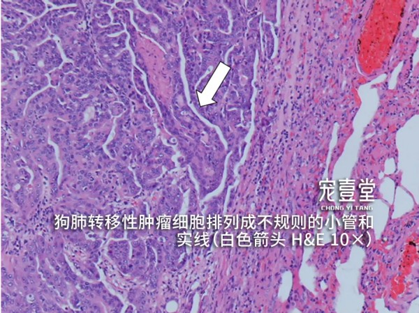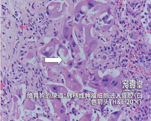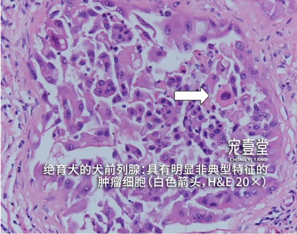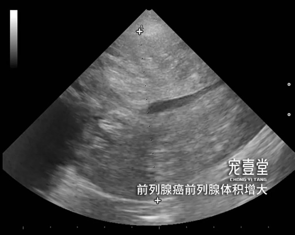 04【诊断标准】 1.根据临床症状、病史和体格检查做出初步诊断。触诊后腹部有明显疼痛反应,可摸到腹部肿块。 2.X线片可清晰看的见腹部前列腺位置的肿块。 3.超声检查可见前列腺明显增大并有强回声。当犬出现泌尿系统疾病时,除需检查肾脏、膀胱、前列腺外,睾丸及附睾也非常重要。前列腺的肿瘤有可能波及到或来自于睾丸及附睾的病变。 4.细针穿刺或活组织检查,可见肿瘤细胞。