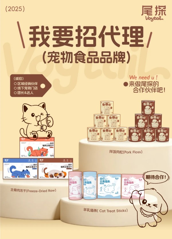 现在,我们有一个更重要的邀请——邀请您,成为 [尾探voytail] 的共创伙伴。我们正在寻找这样的你: 区域经销伙伴:深耕本地市场、及拓展优质宠物线下渠道的经验 跨境代理:了解海外宠物食品市场,可入驻开拓海外实体渠道 优质门店:深耕线下实体门店,希望引入优质品牌 社群群主/团长:已有社群基础,想要引入差异化爆品