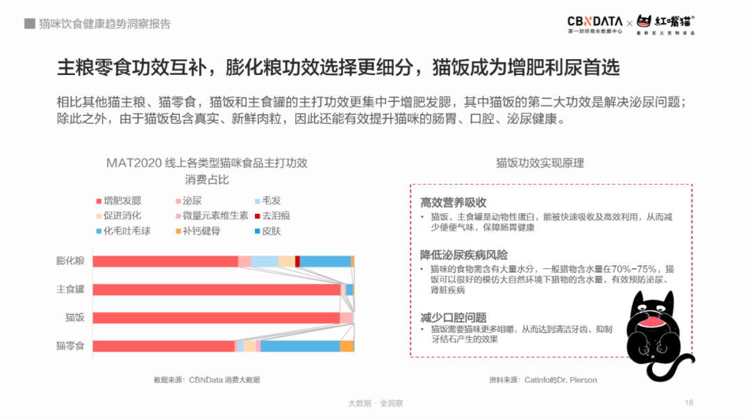 猫主子地位的攀升,“猫家长”们为它们的营养补充操碎了心,单纯的“填饱肚子”早已经不是消费者的考虑因素,多种营养功效的猫粮食补更受期待。CBNData《报告》发现,猫咪食品的增肥发腮、解决泌尿问题、补充营养等功效最受关注。 不同猫咪食品主打功效也各不相同,膨化粮和猫零食功效更加细分,而猫饭的主打功效更集中在增肥发腮和解决泌尿问题上。猫饭中的新鲜肉粒所含有的动物性蛋白营养,可以被猫咪快速吸收,保障猫咪肠胃健康;含水量接近自然食物状态,可以有效预防猫咪泌尿、肾脏疾病;此外,猫饭需要猫咪更多咀嚼,从而能够减少口腔问题。