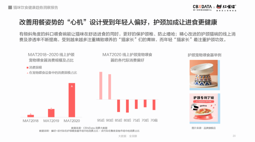 除了猫粮成分和配方,铲屎官们还将目光投向了“科学喂养”上。 具有科学倾斜角度的喂食碗让猫咪舒适进食的同时,达到保护颈椎和防止噎呛的功效,受到年轻“猫家长”们的追捧,市场消费规模持续走高,例如红嘴猫的护颈专利7°碗猫饭,以科学设计与精致造型受到注重精致喂养的“猫家长们”的青睐。