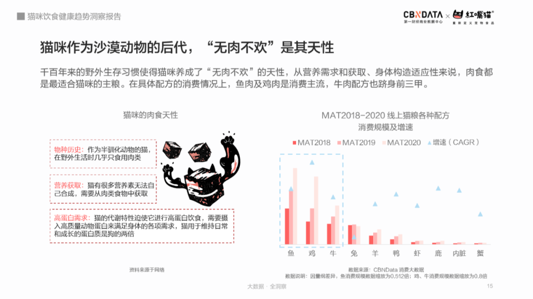 几千年的人类驯化后,家猫与老虎仍共享96%的DNA,从猫咪的营养需求、身体构造的适应性等方面来看,唯有肉食主粮才能满足具有肉食天性的它们。 在线上猫粮配方消费中,鱼肉、鸡肉和牛肉位居消费规模前三甲。猫主粮的产品升级呈现出对猫咪进食习惯的还原过程。例如猫饭中的无加工肉食,在满足猫咪营养需求、符合消化过程、让猫咪畅享肉食盛宴上广受消费者好评。