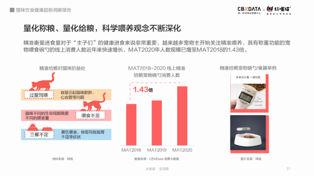 科学喂养观念也体现在“精准量化给粮”上,精准给粮可以满足猫咪不同阶段的成长需求,减少肥胖、心血管、肠胃不适等问题的出现,是猫主子健康成长的有效保护方式。因此,可以称重的宠物喂食碗勺一经出现,便俘获“猫家长”们的消费热情,市场消费人数持续增长,2020年消费人数是2018年的1.43倍。
