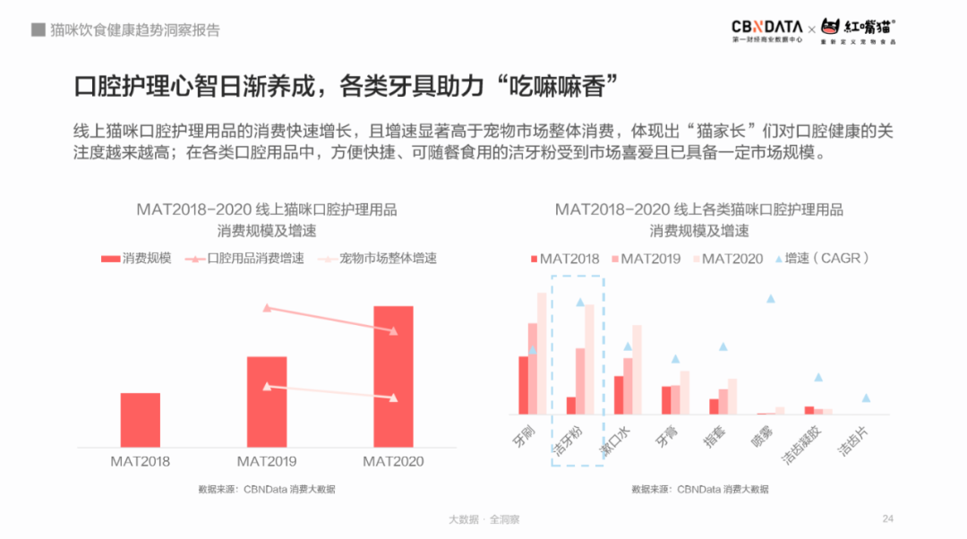 “牙口好,才能吃嘛嘛香”,猫咪的口腔健康也颇受关注。线上猫咪口腔护理用品市场消费规模显著增长,消费增速远超整体宠物市场。CBNData《报告》发现,在各类口腔用品消费中,洁牙粉凭借其方便快捷、可随餐食用的特点受到消费者喜爱。