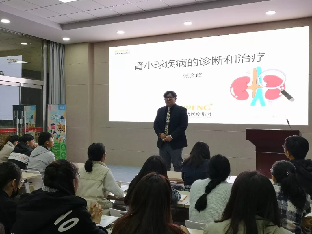 随后魏仁生先生向同学们讲授了关于《肾小球疾病的诊断及治疗》的课题讲座,并叮嘱同学们要学好专业知识,做好学业规划,全面提升个人素质,以积极乐观的心态度过大学生活。最后,青岛爱诺动物医学江西路分院院长张文政先生作为优秀校友代表讲话,向同学们分享了自己的成长经历。他提到,选择一个好的企业至关重要,呼吁更多的学生选择新瑞鹏,选择宠物医疗行业。