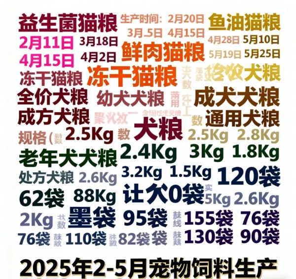 2025年以来,生产添加冻干小包装宠物饲料10批次(2月11日生产2.5Kg**益生菌猫粮62袋;2月15日生产2.5Kg**鱼油猫粮80袋;4月7日生产2.5Kg**1:1猫粮20袋;5月9日生产2.5Kg**幼猫26袋;5月14日生产2.5Kg**鱼油猫粮30袋;5月20日生产2.5Kg**新陆地猫粮96袋;5月24日生产2.4Kg**犬粮45袋;5月24日生产2.5Kg**猫粮40袋;5月25日生产2.5Kg**猫粮30袋;5月25日生产2.5Kg**陆地猫粮155袋),共584袋,均未再进行自检。