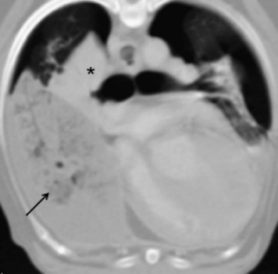 图 5. 一只患右中叶扭转的比格犬的横断高分辨率计算机断层扫描(CT)图像。肺叶尖端指向背外侧方向(箭头),表明肺叶移位和旋转。气胸和轻度胸腔积液也可见。