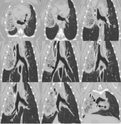 图1. 一只患有右前肺叶扭转的2岁巴哥犬桨轮重建计算机断层扫描(CT)影像。从横断面(左上图)开始,沿支气管分叉处(左上至右下方向)进行多平面重组。所有支气管清晰可辨:a. 左前叶支气管;b. 左后叶支气管;c. 右后叶支气管;d. 副叶支气管;e. 塌陷的右中叶支气管;f. 通向扭转右前肺叶的极短盲端支气管。