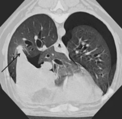 在所有犬中观察到含气支气管管腔突然中断,在9只犬中的5只同时观察到扭转肺叶及其支气管血管结构的位置异常。这被认为是支持肺叶扭转的有力论据。支气管含气管腔突然中断也可能由肿瘤性病变引起