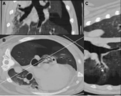 图 6. 一只6岁混种犬患有右中叶部分扭转。背侧重建CT图像(A),左侧卧位横断图像(B)以及图6B所示平面的斜位重建图像(C)。右中叶(*)塌陷,支气管弯曲,但在重建图像中整个支气管可见且充满气体。
