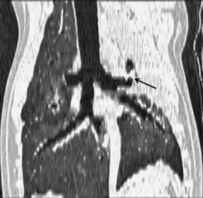 图2. 一只8岁阿富汗猎犬左前叶肺扭转的胸部背侧重建计算机断层扫描(CT)图像。通向左前叶的支气管突然中断(箭头),而更远端的节段再次充满气体并扩张,使支气管呈现扭曲的外观。