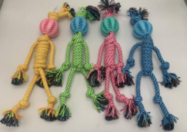 材质:橡胶和棉绳 橡胶小球的锯齿设计可以让爱宠磨牙洁齿,特殊的齿状条纹设计可以放入零食,这样更能吸引狗狗玩玩具的兴趣,减少破坏。 棉绳由多股绳缠绕制成,坚固耐咬,不伤牙齿。