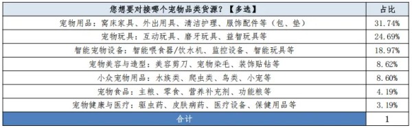 宠物用品(31.74%):窝垫、家具、清洁护理等需求最大,标准化、易运输、高附加值产品是首选。