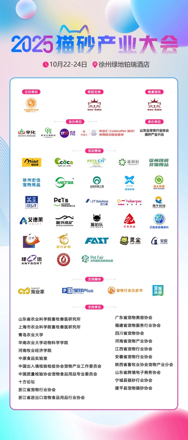 10月22-24日,由山东省宠物行业协会主办、徐州市舒正宠物用品有限公司特别支持,聚焦猫砂产业顶层趋势、产业链协同、品牌增长与未来生态的行业盛会——2025猫砂产业大会,将在江苏徐州举办。