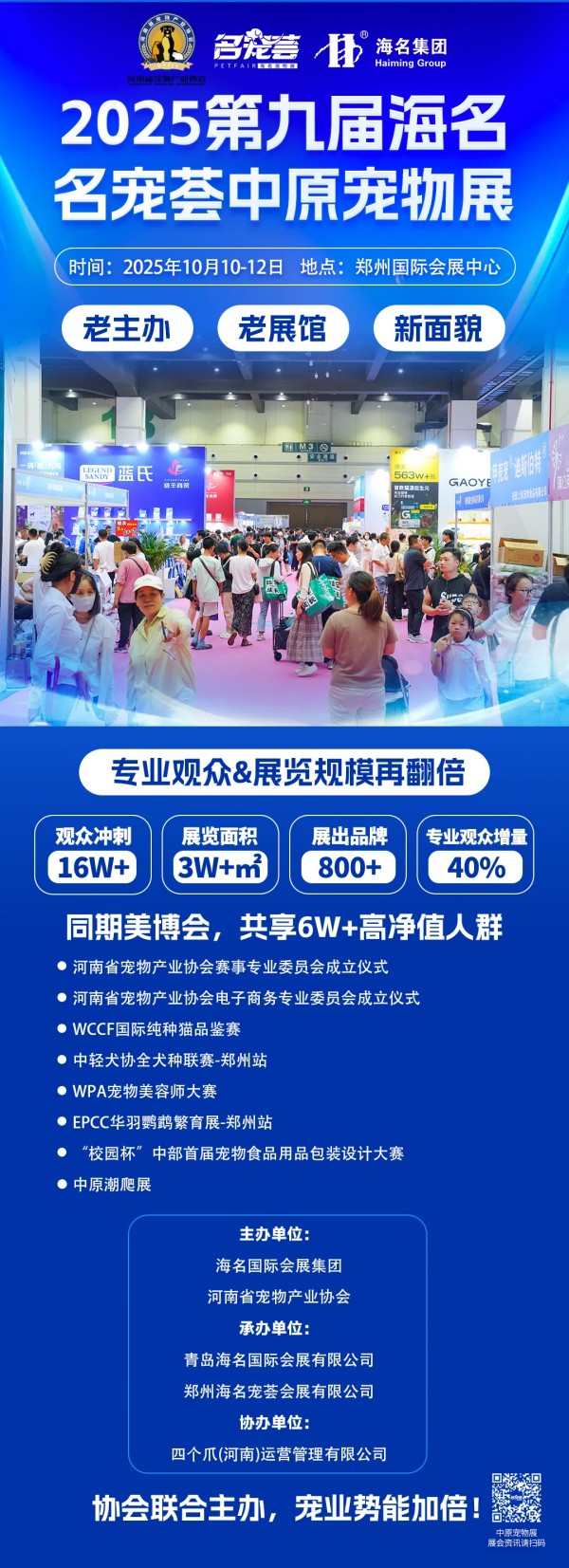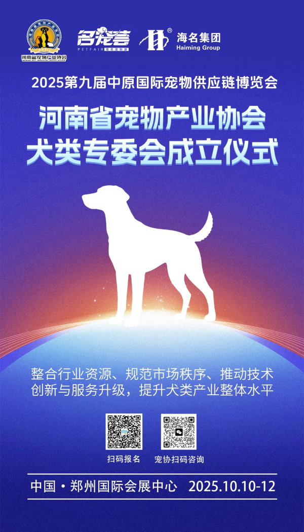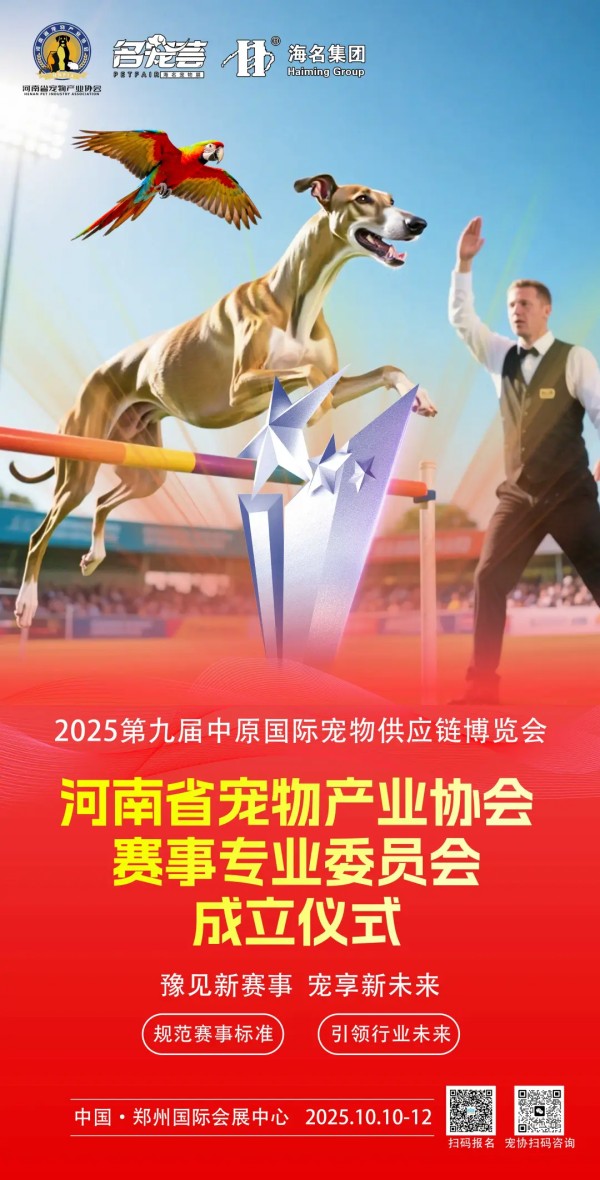 本届展会由海名集团联合河南省宠物产业协会主办,中国小动物保护协会两栖爬行动物分会等协会支持,汇聚800+国内外知名品牌,展览面积超3万㎡,预计吸引8万+高净值观众,打造中部宠业年度标杆盛宴。 展会亮点纷呈:既有蓝氏、鲜生纪、中宠等大牌带来的采购狂欢与展期限定折扣,也有犬猫鹦鹉水族赛事、宠物综艺海选等5大主题活动轮番上演;同时搭建精准供需匹配平台,在商贸对接、品牌曝光、技术研讨等方面全方位赋能。 河南省宠物产业协会赛事专业委员会成立仪式 河南省宠物产业协会犬类专委会成立仪式 (部分梯媒) 10月10-12日,郑州国际会展中心,第九届中原宠物展邀您共赴盛会,推动中原宠业与全国供应链深度链接,打造中部地区标杆商贸平台。