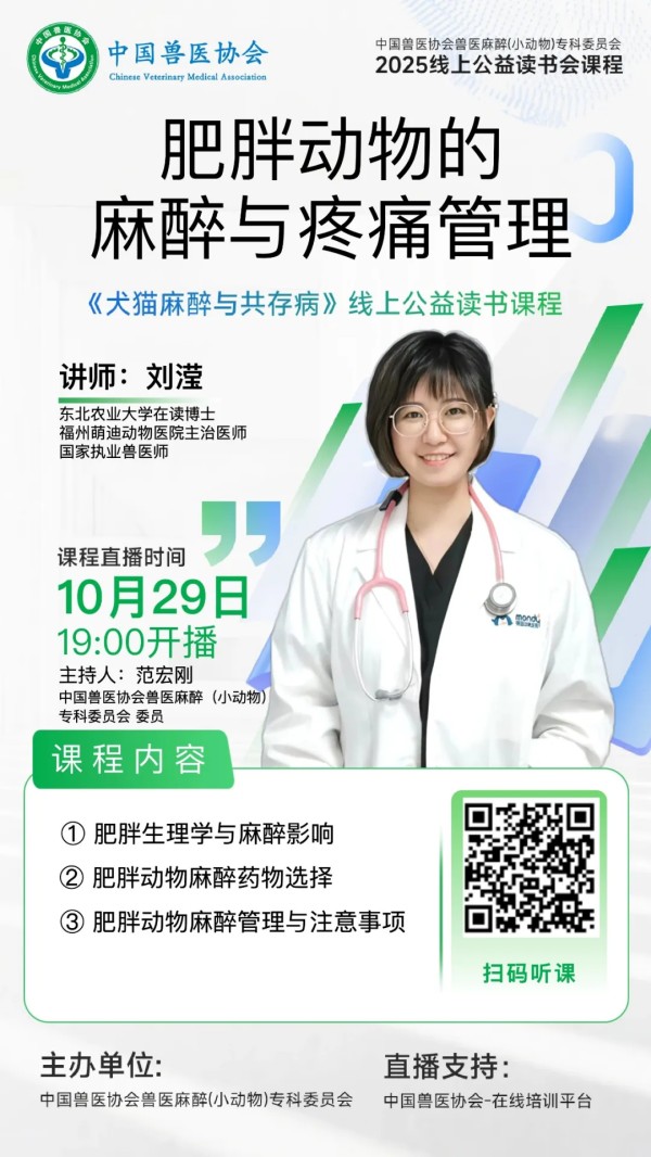线上公益读书会肥胖眼下已是伴侣动物常见的健康问题,而体重过重的动物发生各类麻醉并发症的风险较高,为麻醉医生带来了额外的挑战。本次分享将着眼于肥胖动物的麻醉与疼痛管理,从肥胖本身的病生理学到麻醉诱导、麻醉维持、术后照顾以及术后体况调整相关的注意事项等方面详细探讨,以助力临床麻醉工作。欢迎广大同行积极参与探讨!
