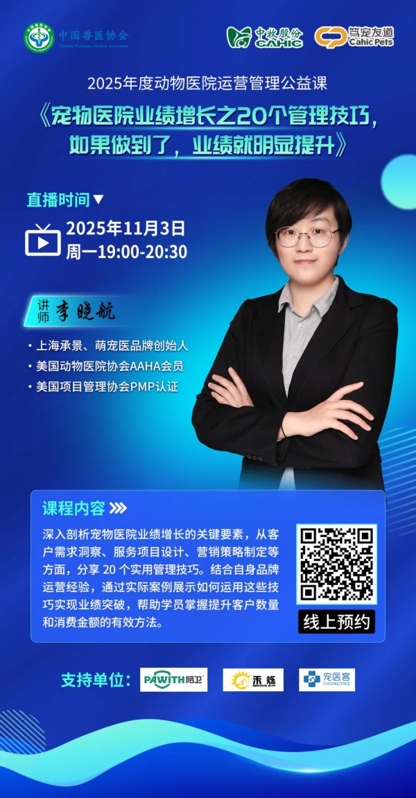 近年来,中国宠物市场规模持续扩大,2024年已突破3000亿元,动物医院作为宠物医疗服务的核心载体,数量呈爆发式增长。然而,行业快速发展的同时,也暴露出诸多问题:多数动物医院缺乏科学的运营管理体系,在营销推广上手段单一,难以吸引客户;服务流程不规范,导致客户流失严重;内部管理粗放,成本居高不下;战略定位模糊,制约了长远发展。 中国兽医协会立足行业痛点,联合中牧实业股份有限公司共同推出2025年度动物医院运营管理公益课,旨在通过专业课程培训,帮助动物医院提升运营管理水平,实现可持续发展。