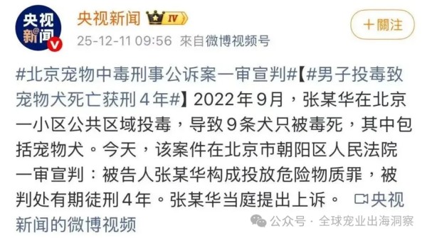 02 地方动态 北京首例宠物 中毒刑事公诉宣判 据央视新闻报道,2025 年 12 月 11 日,北京首例宠物投毒案一审宣判,被告人张某某因犯投放危险物质罪获刑四年。 据悉,2022 年 9 月,张某某在朝阳某小区公共区域投放含剧毒 “氟乙酸钠” 的鸡脖,致 11 只宠物狗中招、9 只惨死。受害者李女士辞职维权,案件历经 9 次延审,耗时两年多终有结果,张某某当庭上诉且拒绝赔偿。 法律层面,本案因在公共区域投放剧毒物质,危及不特定人群安全,而非单纯 “毁财”,故以投放危险物质罪定罪(量刑 3-10 年)。若针对特定宠物,未危害公共安全,则按故意毁坏财物罪论处,情节严重可判 3-7 年。 宠物主人遇此类情况需做好防范:遛狗牵绳、戴嘴套;疑似中毒立即送医并留存毒物样本;报案时强调公共安全风险,及时固化现场证据、委托司法鉴定。本案暴露动物保护法律短板,专家呼吁完善立法,承认宠物情感价值,震慑虐杀行为。 花都成立广州 首个宠物产业协会 近日,花都区成立广州首个宠物产业协会,同步举办 “花都宠你” 首届宠物嘉年华,活动由相关单位指导,200 余名行业代表、市民等参与。大会表决通过协会章程与自律公约,选举产生首届领导机构,广州栋枫实业控股为会长单位,协会将搭建产业服务平台,推动花都宠物产业向专业化、品牌化发展。 目前花都已形成覆盖诊疗、养殖、食品用品等领域的完整宠物产业链,企业超千家,协会会员覆盖产业核心板块。嘉年华设置宠物赛事、异宠互动、潮品展示、义诊等特色板块,丰富人宠互动体验。 花都在宠物友好建设上成效显著:创新流浪犬猫救助模式,设 63 个宠物免费接种点,实现社区免疫全覆盖,连续 11 年无狂犬病;启用智慧畜牧兽医平台,免疫可追溯。未来,花都将以协会成立为契机,培育龙头企业、推动全链发展,打造宠物友好标杆城市。