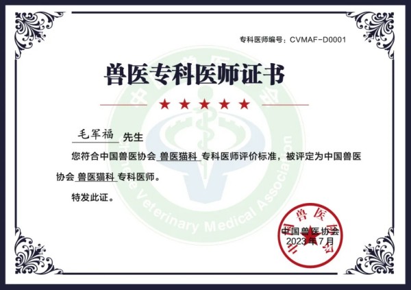 猫科在传统的专科分科体系中,并不是一个专科,而猫却具有独特的行为和生理特征,无论是行为模式和疾病类型都与犬不同。随着近年来猫数量的增加,猫科诊疗在医院也面临巨大挑战,因此需要一个体系化的学习和临床诊疗模式的改变,而猫科疾病的综合性、复杂性也进一步推进兽医猫科专科建设的发展。由于毛军福较早从事猫科临床诊疗,也希望猫科诊疗能进一步规范化,因此研究国外猫科医学发展的一些经验后,率先在中国兽医协会申请创建猫科专科委员会(2023年7月3日正式成立),并担任主任,对猫科知识体系进行梳理,确立猫科专科医生的培养体系,明确猫科专科医生培养机构的要求,帮助医生快速成长,成为猫科专科医生。