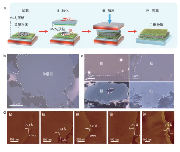 在这项研究中,中国科学院物理研究所研究员张广宇带领团队,发展了原子级制造的范德华挤压技术,通过将金属熔化并利用单层二硫化钼作为范德华压砧挤压,成功实现原子极限厚度下各种二维金属的普适制备。
