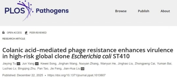 近日,兽医学院博士研究生涂婕莹以第一作者身份在国际知名期刊《PLOS Pathogens》 (中科院微生物学一区Top期刊)发表题为“Colanic acid–mediated phage resistance enhances virulence in Escherichia coli ST410”(https://journals.plos.org/plospathogens/article?id=10.1371/journal.ppat.1013807)的研究论文,揭示了噬菌体抗性与细菌毒力之间的复杂关联。
