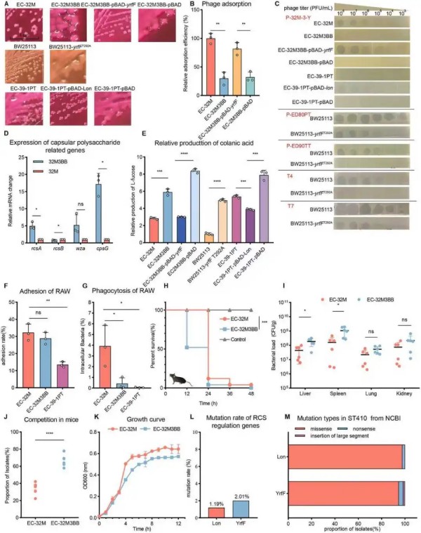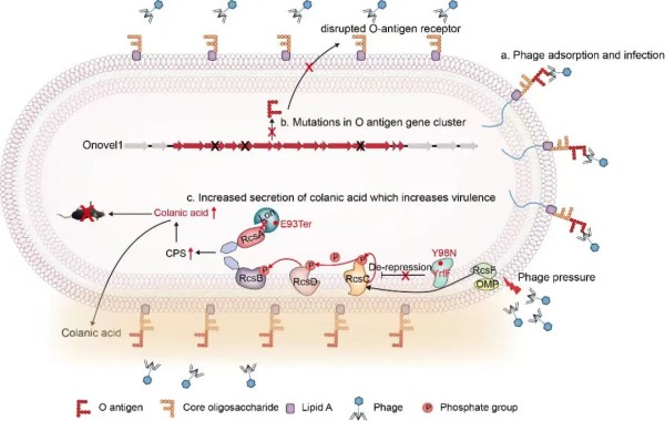 细菌耐药问题日益严峻,迫切需要寻找抗生素替代方案。噬菌体疗法被认为是应对耐药菌感染的重要替代策略之一,然而,噬菌体施加的选择压力可能促使细菌进化出新的抗性机制,并对其生物学特性产生深远影响,其潜在风险尚缺乏系统研究。 该研究围绕“噬菌体抗性进化是否会影响细菌毒力”这一关键科学问题,以在全球各生态位广泛传播的高风险克隆株E. coli ST410为研究对象,系统解析了细菌在噬菌体压力下获得抗性的分子机制及其生物学后果。研究发现,除了通过噬菌体受体突变介导噬菌体抗性外,细菌可通过大量上调胞外多糖--可拉酸(colanic acid)合成,在细胞表面形成保护性屏障,从而有效阻断噬菌体的吸附与侵染,产生稳定的噬菌体抗性表型。值得注意的是,可拉酸分泌增多不仅影响噬菌体-细菌相互作用,还可增强细菌对宿主免疫细胞的抵御能力,从而提高细菌的毒力。 该研究从机制层面揭示了噬菌体抗性与细菌毒力增强之间的内在联系,为理解噬菌体-细菌协同进化提供了新视角,并提醒我们在开发和应用噬菌体防控策略时,需充分评估其对病原菌致病性和适应性演化可能带来的潜在影响,对噬菌体疗法的安全性和长期效果具有重要警示意义。广东药科大学杨军副研究员(原兽医学院博士后)为论文的共同第一作者,兽医学院刘健华教授为论文的通讯作者,相关研究工作得到国家自然科学基金专项项目(32141002)和国家重点研发计划项目(2022YFC2303900)的资助支持。