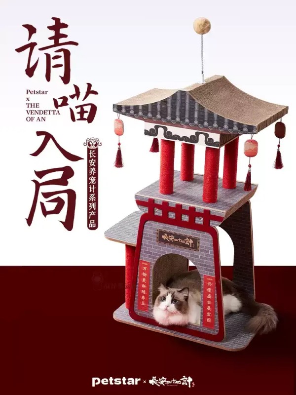 3、Petstar望塔戏猫阁猫爬架 (长安二十四计联名) ①剧中名筑落喵台,古纹精琢韵自来;多层叠筑抓握分区,棉绳绕柱抓挠紧实 ②层台错落任喵游,上跃下钻意未休;瓦楞置顶供瓜磨,棉绳缠柱修利甲 ③亭中卧榻承娇体,一筑三宜乐事多;舒适耐抓屑不飘,岁岁磨挲形如故