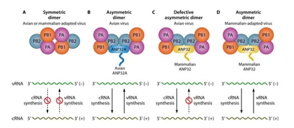从分子组装的角度看,ANP32的作用更像是病毒复制“流水线”上的督导员:它协助病毒RNA聚合酶从对称结构组装成功能性的不对称二聚体,这是病毒基因组复制与包装的关键一步。