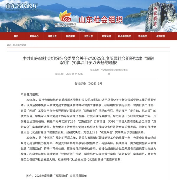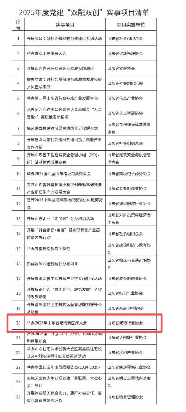 近日,中共山东省社会组织综合委员会发布《关于对2025年度所属社会组织党建“双融双创”实事项目予以表扬的通报》(鲁社综委〔2026〕1号),对25个优秀实事项目予以通报表扬。其中,由山东省宠物行业协会申报并成功实施的“2025宠物新医疗大会”项目光荣上榜,充分彰显了协会在党建引领宠物行业高质量发展中的积极作为与突出成效。