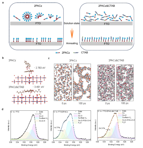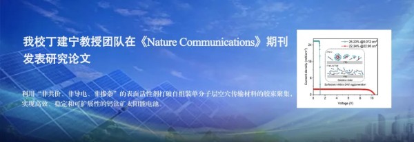 近日,我校丁建宁教授团队联合瑞士洛桑联邦理工学院、东南大学等研究人员,在《Nature Communications》期刊发表题为“Anti-aggregation self-assembled monolayers enable high-performance and scalable perovskite solar cells”的研究论文。 该研究通过引入十六烷基三甲基溴化铵(CTAB)作为调节剂,抑制自组装单分子层(SAM)空穴传输材料[2-(9H-咔唑-9-基)乙基]膦酸(2PACz)的胶束聚集,实现了高质量SAM的制备,显著提升了钙钛矿太阳能电池的光电转换效率、稳定性和可扩展性。钙钛矿太阳能电池作为新一代光伏技术,基于p-i-n型器件效率已突破26%,其中SAM作为空穴传输层起到关键作用。然而,SAM分子在沉积过程中易发生聚集形成胶束,导致薄膜覆盖不连续、界面缺陷增多等问题,制约了器件性能与大面积制备的可能。 针对该问题,研究团队创新性地采用非自组装、非导电的低成本常规表面活性剂CTAB。并通过理论计算结合实验表征证明CTAB与2PACz之间的静电非键合相互作用,抑制了SAM分子团簇化,促进了SAM在基底上的均匀分散与稳固锚定,从而实现覆盖完整、均匀的高质量SAM薄膜。最终采用CTAB修饰SAM实现了26.20%的光电转换效率(活性面积0.072 cm²)。其开路电压、短路电流密度和填充因子均得到显著提升。此外,基于该策略制备的大面积组件(22.96 cm²)效率达到22.34%,且器件在连续最大功率点跟踪800小时后仍保持80%以上的初始效率,展示出良好规模化制备潜力与运行稳定性。该研究为钙钛矿太阳能电池界面工程提供了新思路,通过简单、易得的表面活性剂调控策略,有效解决SAM聚集问题,有利于推动高效、稳定、大尺寸钙钛矿光伏器件的发展。 论文第一作者为物理学院博士生杜开怀,共同通讯作者为我校丁建宁教授,王爱丽、李绿洲副教授,瑞士洛桑联邦理工学院Mohammad Khaja Nazeeruddin教授以及东南大学李桂香教授。该研究工作获得了国家自然科学基金等相关科研项目资助。 帆已扬星已摘 CATB平凡活性剂 托起了太阳能电池璀璨的未来 故事不止于刊物的卷首 YZUers将不辍奋斗 继续向光而行