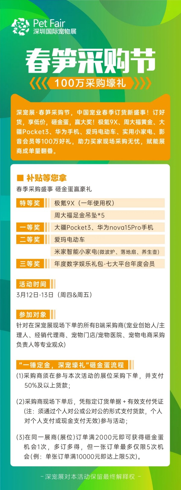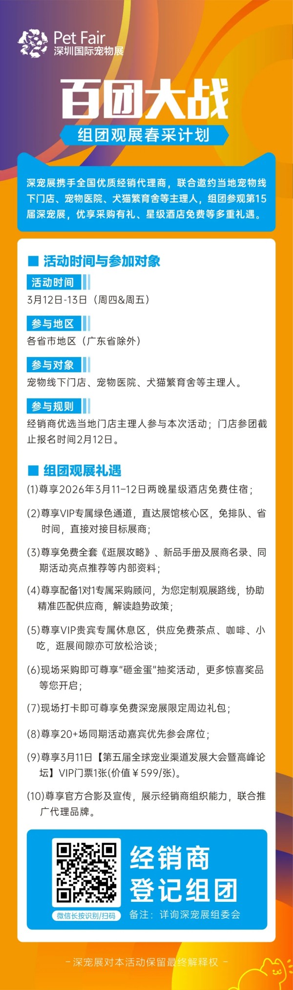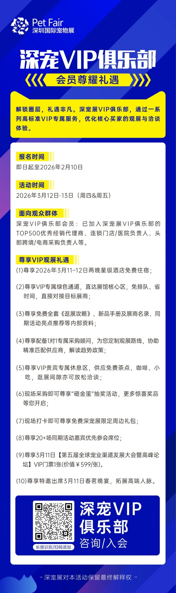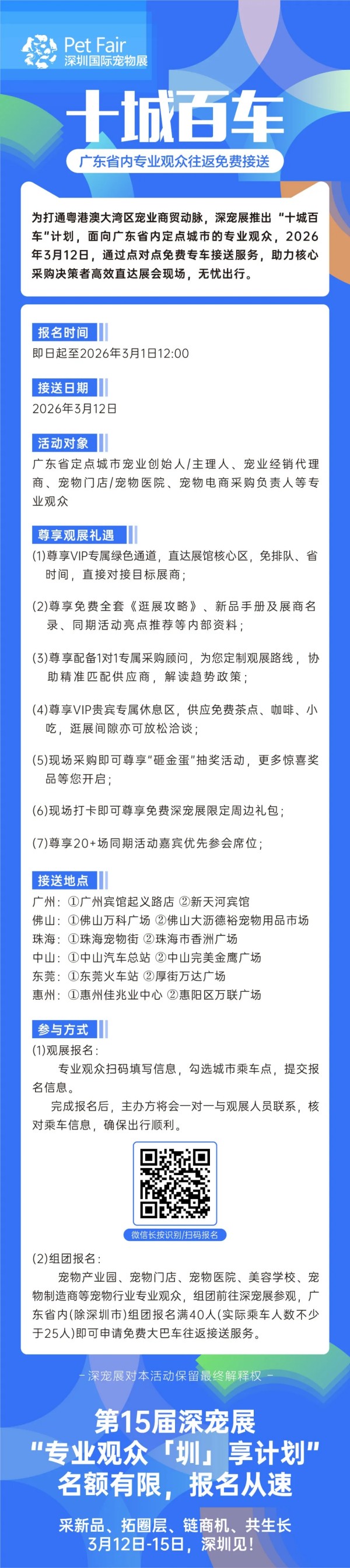 2026中国宠物行业开年首展!第15届中国(深圳)国际宠物用品展览会暨全球宠业跨境电商交易会,将于3月12日—15日,深圳会展中心(福田)盛大举办!本届展会汇聚全球1000+优质展商,100000+潮宠好物、5000+年度新品,汇集宠物衣、食、住、行全产业链,预计吸引20万宠业同仁齐聚深圳。 第15届深宠展,高效对接经销代理商、零售门店、国内电商、跨境电商等全渠道,全面升级观展体验!同期推出:“春笋采购节”,中国宠业春季订货新盛事,下单即享百万抽奖壕礼;“百团大战” ,组团观展,享专属通道与星级住宿;“全球海外采购团VIP礼遇”, 全球TOP1000+采购商,提供全程VIP接待与一对一商贸对接;“深宠VIP俱乐部” 解锁宠业顶级圈层,尊享全周期专属尊耀服务;“十城百车”,100辆巴士直达粤港澳大湾区重点城市,免费往返接送广东省内专业观众到场观展!来第15届深宠展,共赴年度宠业盛会!
