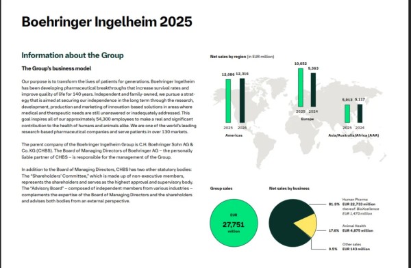 近日,全球知名制药与动物保健企业勃林格殷格翰(Boehringer Ingelheim)公布了2025年全年业绩报告。期内,集团整体表现稳健,实现净销售额277.51亿欧元,同比增长4%。