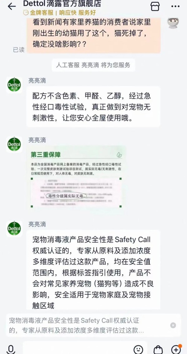 事后,陈女士联系滴露客服,被告知需等待7至14天处理,随即向12315投诉。但当地宠物医院均无法开展幼猫尸检与毒理检测,加之猫尸已存放三天,她不忍幼猫再遭解剖,最终放弃追责、中止调解,不接受赔偿与道歉,仅发帖提醒养宠人谨慎使用宠物消毒产品。