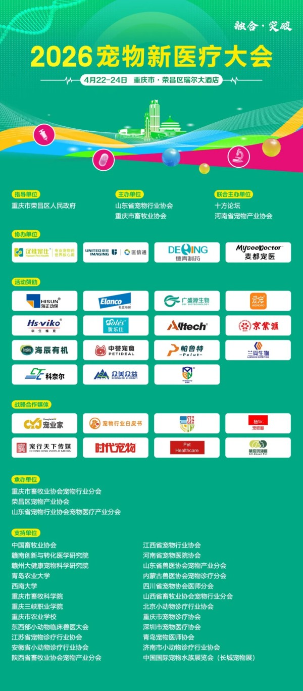 4月22-24日,由重庆市荣昌区人民政府指导,山东省宠物行业协会、重庆市畜牧业协会主办,十方论坛、河南省宠物产业协会联合主办,上海汉维生物医药科技有限公司、上海联影医信通科技有限公司、山东德青制药有限公司、麦都宠医(上海)科技发展有限公司协办;重庆市畜牧业协会宠物行业分会、荣昌区宠物产业协会、山东省宠物行业协会宠物医疗产业分会承办的2026宠物新医疗大会,将在重庆荣昌盛大举办。
