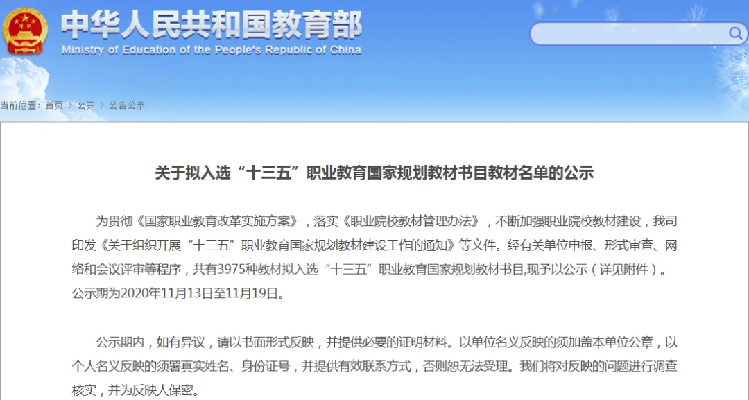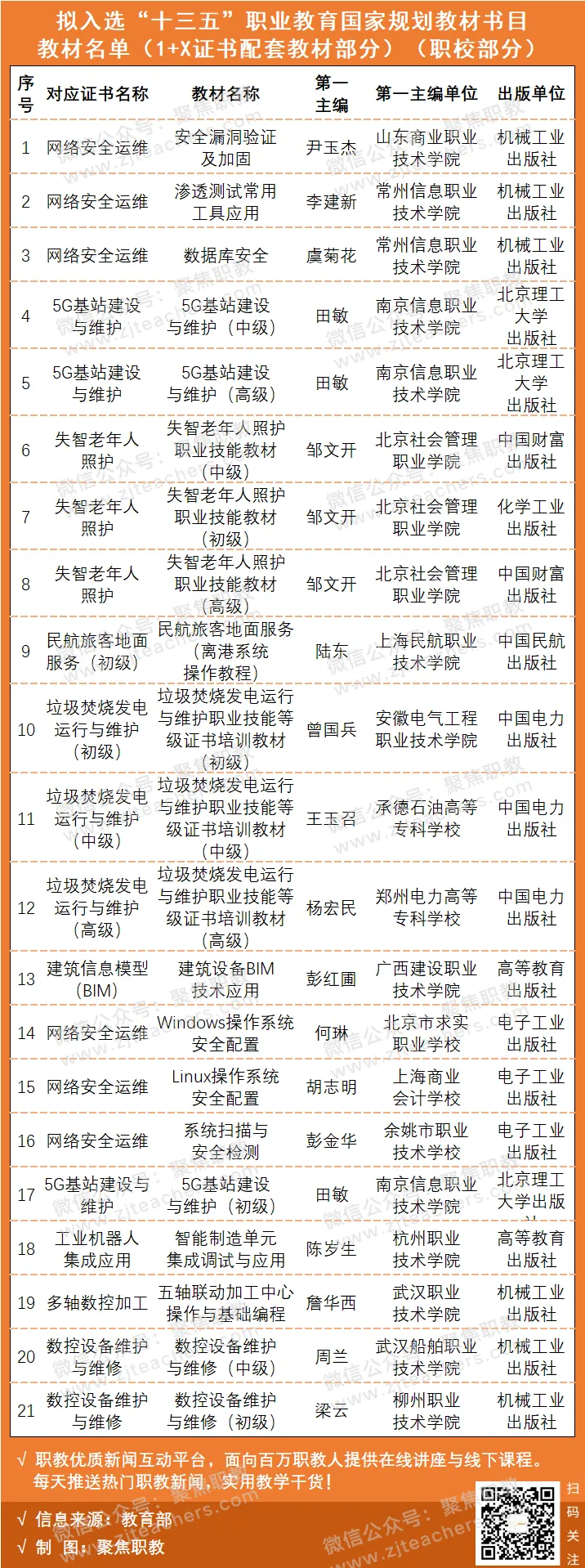 教育部发布拟入选“十三五”职业教育国家规划教材书目教材名单,共有3975种教材拟入选“十三五”职业教育国家规划教材书目。其中,高职有2830种教材入选,中职有1069种教材入选,此外,还有76种1+X证书配套教材入选。名单显示,76种1+X证书配套教材中,职业院校作为第一主编单位的有21种教材。详情如图所示: