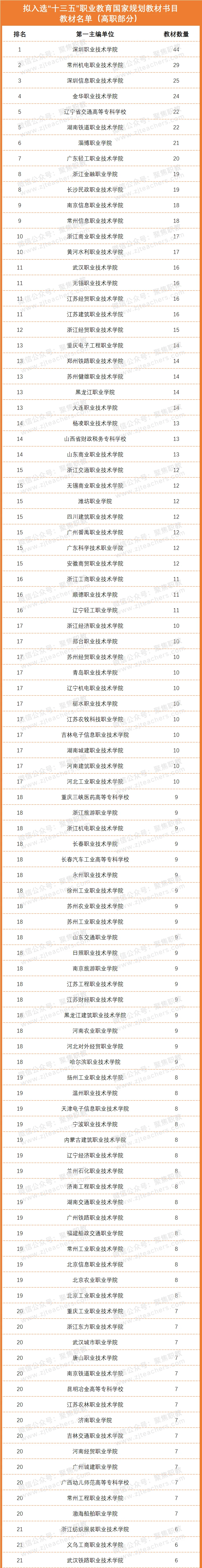 聚焦职教根据公示名单分别统计了高职院校和中职院校拟入选“十三五”职业教育国家规划教材书目数量排行榜。由于篇幅较长,我们分两篇展示。我们先了解高职院校的情况。(公众号第二篇文章为中职院校情况)根据统计,共有560所高职院校作为第一主编单位编写的教材入选“十三五”职业教育国家规划教材。深圳职业技术学院以44种教材遥遥领先,名列高职排行榜第一。