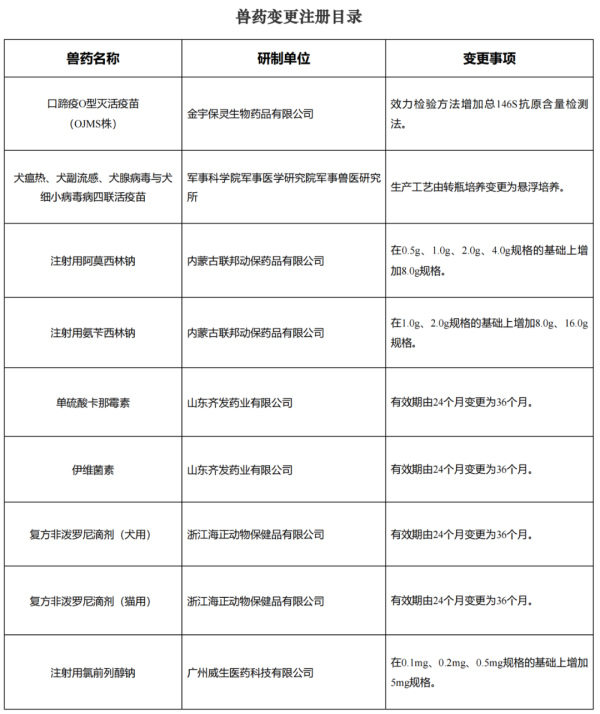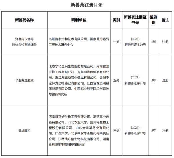 根据《兽药管理条例》和《兽药注册办法》规定,经审查,批准洛阳普泰生物技术有限公司等18家单位申报的猪塞内卡病毒胶体金检测试纸条等3种兽药产品为新兽药,核发《新兽药注册证书》,发布产品工艺规程、质量标准、说明书和标签,并发布卡洛芬的每日允许摄入量和最高残留限量(试行)及卡洛芬残留检测方法标准(试行),自发布之日起执行。批准金宇保灵生物药品有限公司等2家单位申报的口蹄疫O型灭活疫苗(OJMS株)等2种兽药产品变更注册,并发布修订后的工艺规程、质量标准、说明书和标签。批准内蒙古联邦动保药品有限公司等4家单位申报的注射用阿莫西林钠等7种兽药产品变更注册,自发布之日起执行。