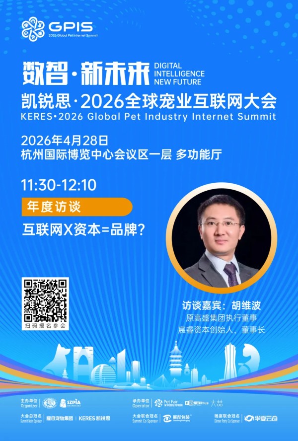 本次大会荣幸邀请到了宸睿资本创始人胡维波先生出席年度访谈,访谈主题为“互联网×资本=品牌?”。凭借其近20年大消费领域投融资与并购整合经验,以及在高盛集团、中信证券等顶级机构的深厚积淀,深度分享宠物行业如何借力互联网与资本双轮驱动,打造具有全球竞争力的品牌。他将围绕消费品牌成长逻辑、宠业投融资趋势、资本赋能数智化转型与全球化扩张等核心议题,为在场宠企提供可落地的品牌增长参考,助力中国宠企打通“产品-流量-品牌”的价值链,抢占新消费时代的战略高地。
