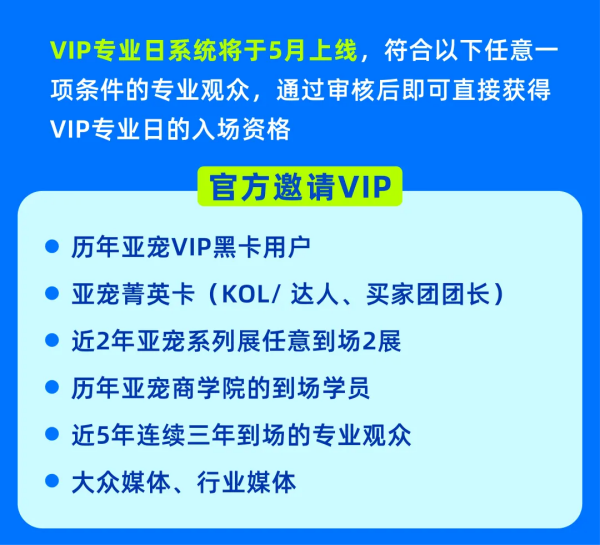 2026亚宠展,我们将把展会首日倾力打造成凭“邀请制”入场的「VIP专业日」,携手展商定向邀请核心渠道商、海外买家、VIP客户、特邀媒体等专业观众到场,把商务洽谈拉回高密度黄金期,全面升级展会高效的商贸体验,这也是今年亚宠重要的战略创新之一。