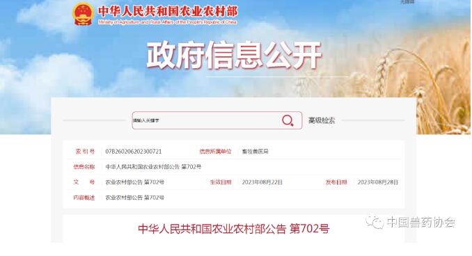 批准勃林格殷格翰动物保健有限公司法国吐鲁兹生产厂生产的阿福拉纳咀嚼片和阿福拉纳米尔贝肟咀嚼片在我国变更注册,并发布修订后的说明书和标签,自发布之日起执行,此前发布的该2种兽药说明书和标签同时废止,质量标准分别参照农业农村部公告第517号和农业农村部公告第642号同品种执行。批准英特威国际有限公司奥地利生产厂生产的氟雷拉纳咀嚼片在我国变更注册,并发布修订后的说明书和标签,自发布之日起执行,此前发布的该兽药说明书和标签同时废止,质量标准参照农业农村部公告第165号同品种执行。批准硕腾公司美国卡拉玛祖生产厂生产的赛拉菌素滴剂在我国变更注册,并发布修订后的质量标准,自发布之日起执行,此前发布的该兽药质量标准同时废止, 说明书和标签参照农业农村部公告第440号同品种执行。批准禧欧公司生产的复方季铵盐戊二醛溶液在我国变更注册。