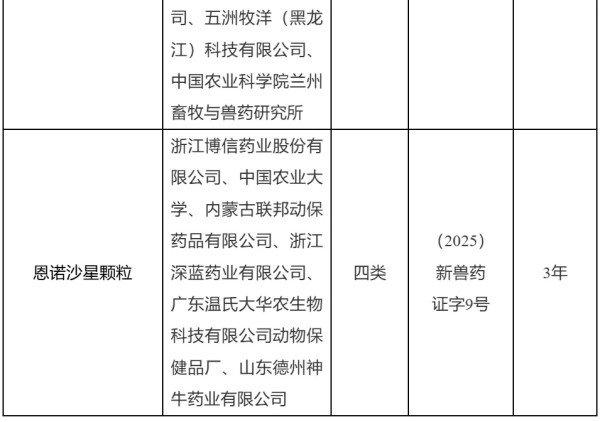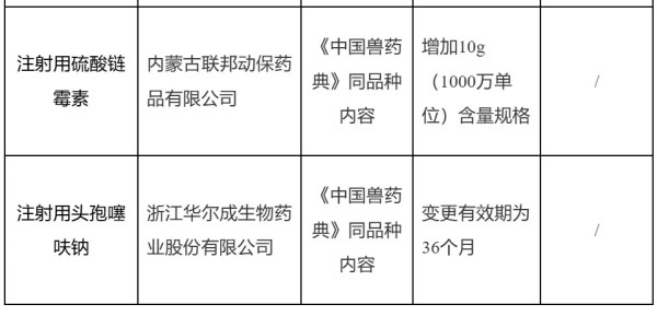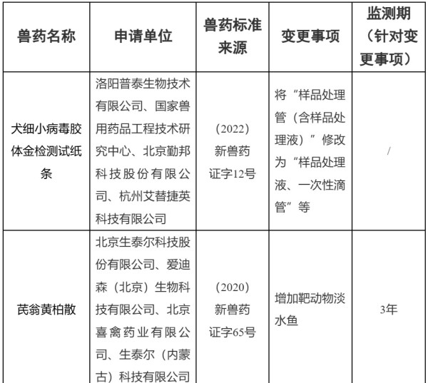 批准洛阳普泰生物技术有限公司等4家单位申报的犬细小病毒胶体金检测试纸条变更注册,发布修订后的质量标准、工艺规程、说明书和标签,自发布之日起执行,此前发布的该产品质量标准、工艺规程、说明书和标签同时废止;批准北京生泰尔科技股份有限公司等4家单位申报的芪翁黄柏散变更注册,发布修订后的说明书和标签,自发布之日起执行;批准内蒙古联邦动保药品有限公司等2家单位申报的注射用硫酸链霉素等2种兽药产品变更注册,申请人按照农业农村部批准的变更事项,自行修改原批准的说明书和标签对应内容,并印制、使用。