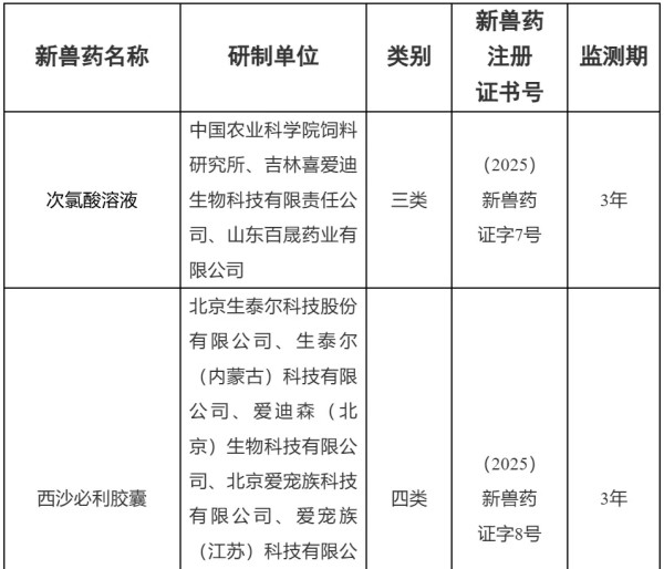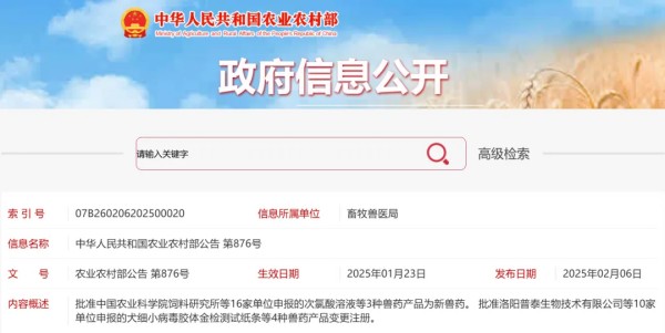 鲁宠协消息:2月6日,农业农村部发布了第876号公告:根据《兽药管理条例》和《兽药注册办法》规定,经审查,批准中国农业科学院饲料研究所等16家单位申报的次氯酸溶液等3种兽药产品为新兽药,核发《新兽药注册证书》,发布产品质量标准、工艺规程、说明书和标签,自发布之日起执行。