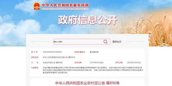 牛支原体灭活疫苗 (HM株) | 天康生物制药有限公司、天康制药股份有限公司、哈药集团生物疫苗有限公司 | 二类 | (2025) 新兽药 证字25号 | 4年 |