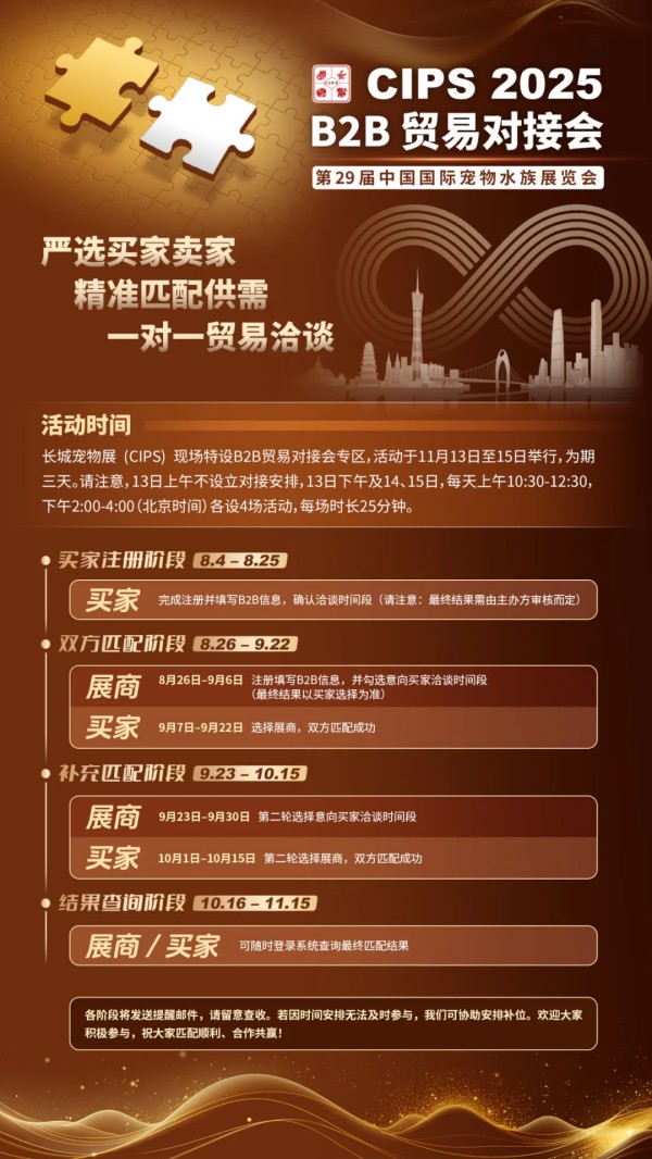 为推动展商与买家开展更高效的现场交流,长城宠物展将在展会期间推出“B2B贸易对接会”专属洽谈活动。通过线上互选机制,买家与展商可在前期确认匹配意向并于现场进行一对一洽谈,精准对接合作资源,推动商机落地转化。